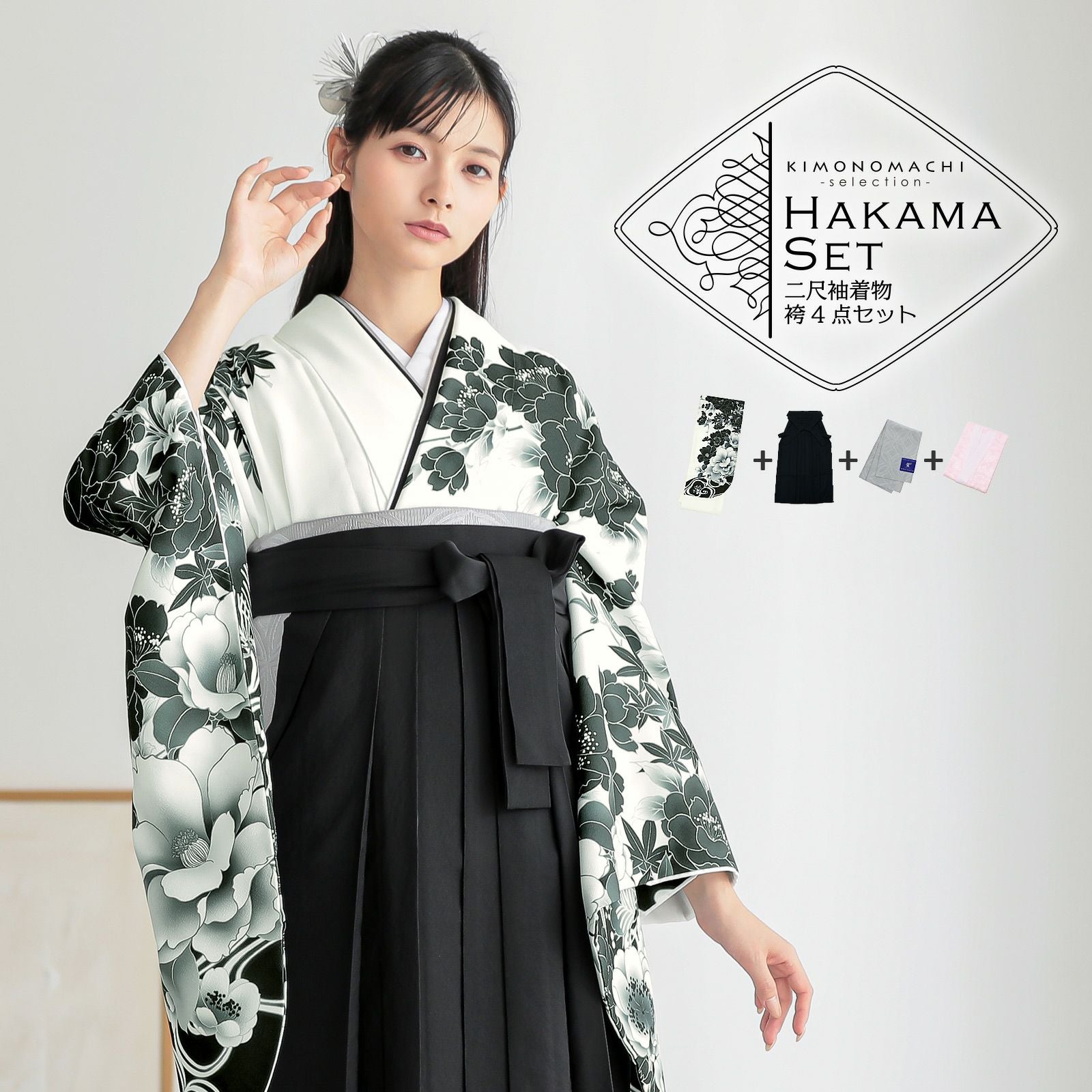 (卒業式応援SALE3/31迄)袴 セット 卒業式 女性 4点セット「二尺袖:白地、黒 四季花に流…